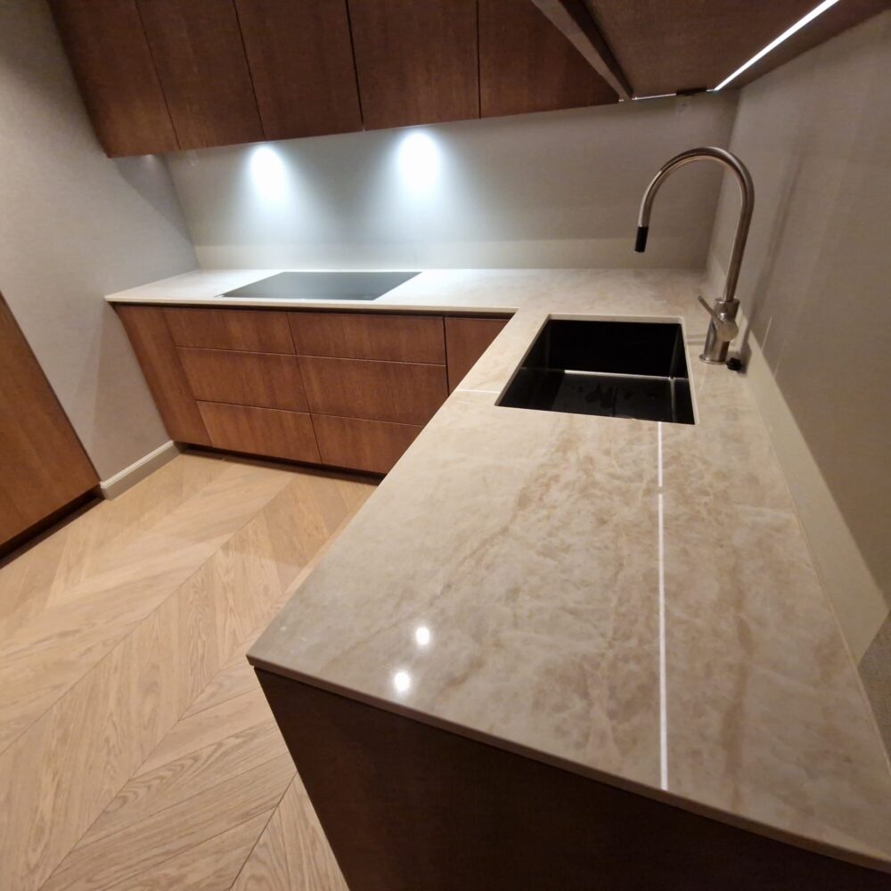 Vi tilbyr nå komplette løsninger med oppmåling og montering av benkeplater i stein, inkludert Dekton, granitt og kompositt, ferdig tilpasset ditt kjøkken.