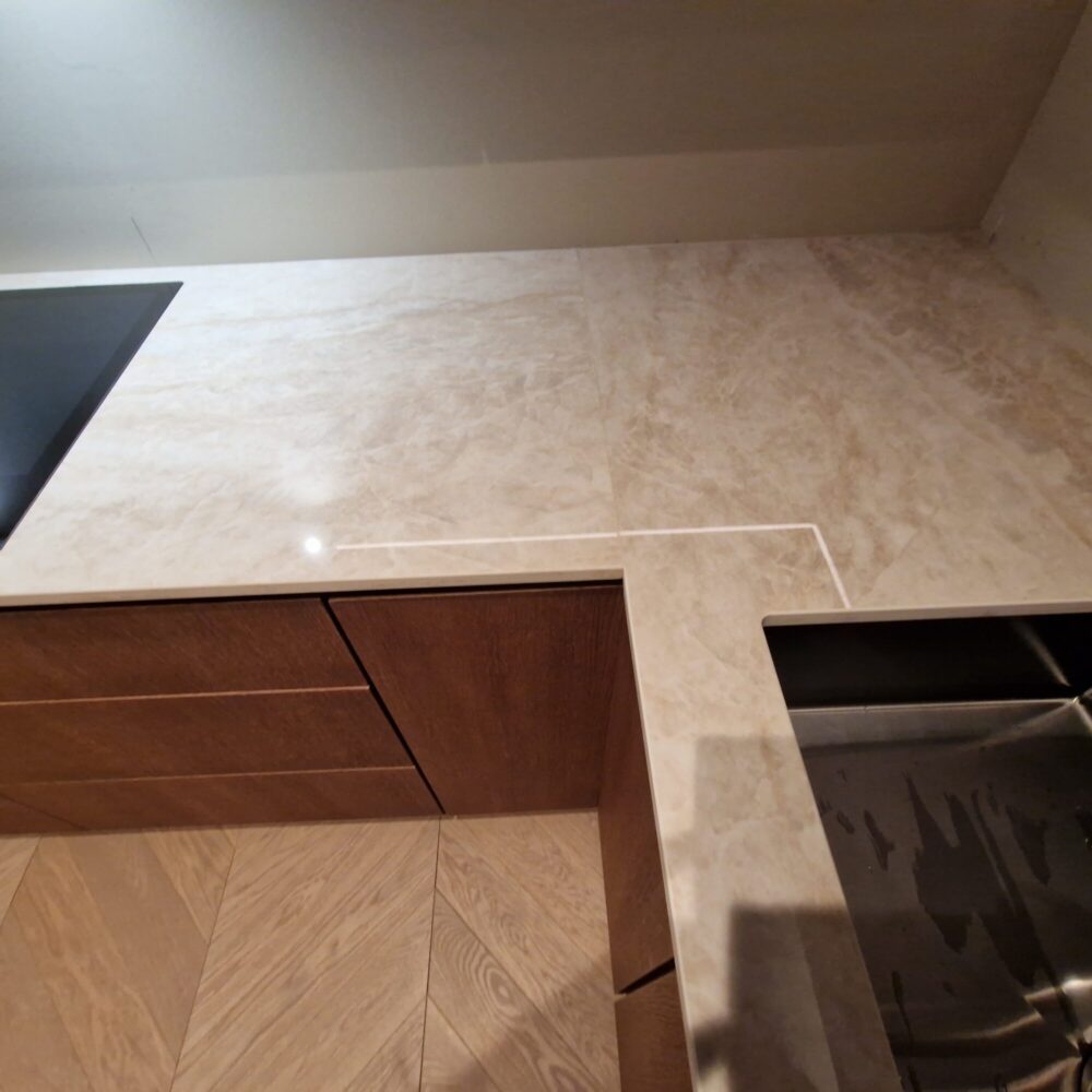 Vi har levert en eksklusiv Dekton Arga benkeplate, en moderne stein benkeplate til kjøkken. Denne kjøkken benkeplaten i steiner produsert i L-form og gir et stilrent og funksjonelt kjøkken.