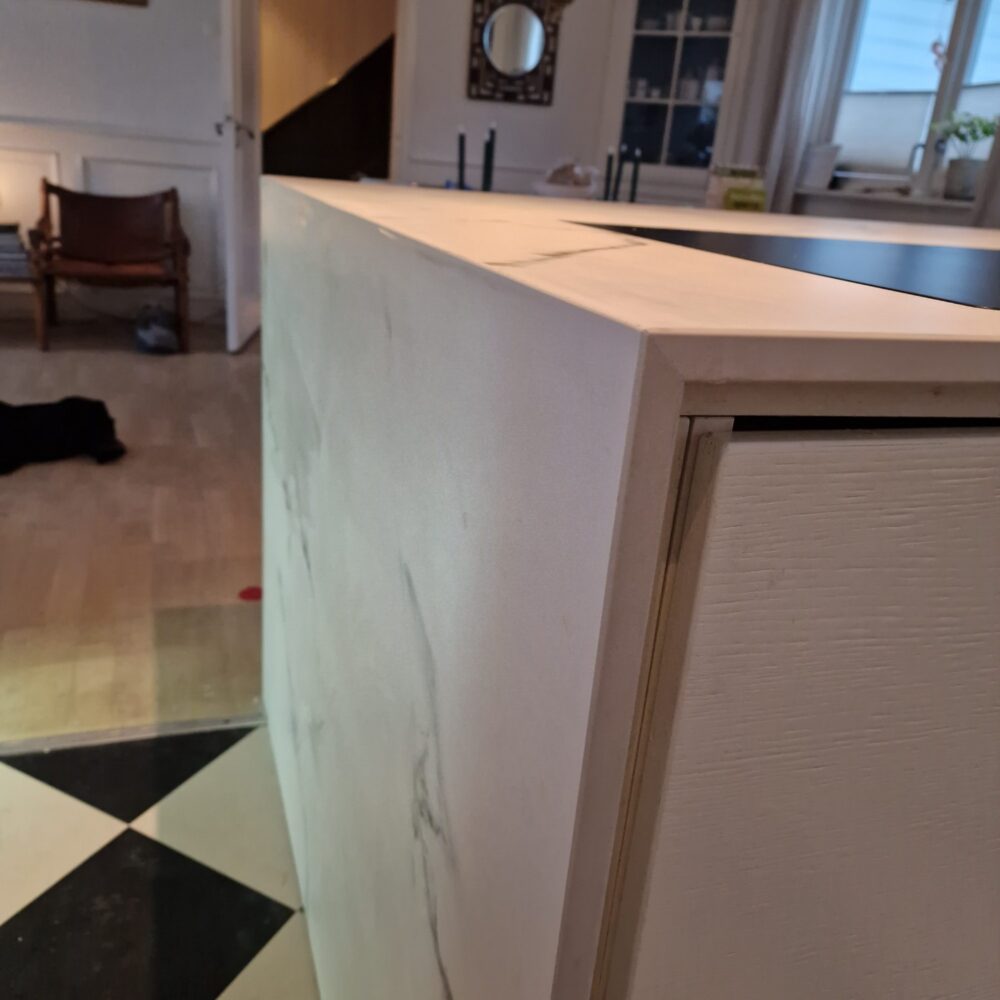 Vi har levert en eksklusiv benkeplate i Dekton Kairos 20 mm til en 3 meter lang kjøkkenøy i Trondheim. Dette er en moderne kjøkken benkeplate i stein med waterfall hvor mønsteret treffer sømløst fra topp til side.