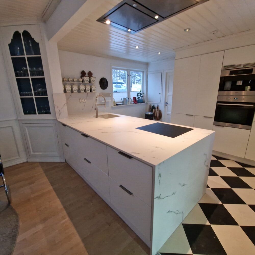 Ved å bytte kun benkeplate i stedet for hele kjøkkenet, får du en bærekraftig kjøkkenoppgradering med mindre materialbruk og lavere kostnader. En kjøkkenbenkeplate i Silestone er både slitesterk, vedlikeholdsvennlig og motstandsdyktig mot flekker og riper – perfekt for et funksjonelt og stilrent kjøkken.